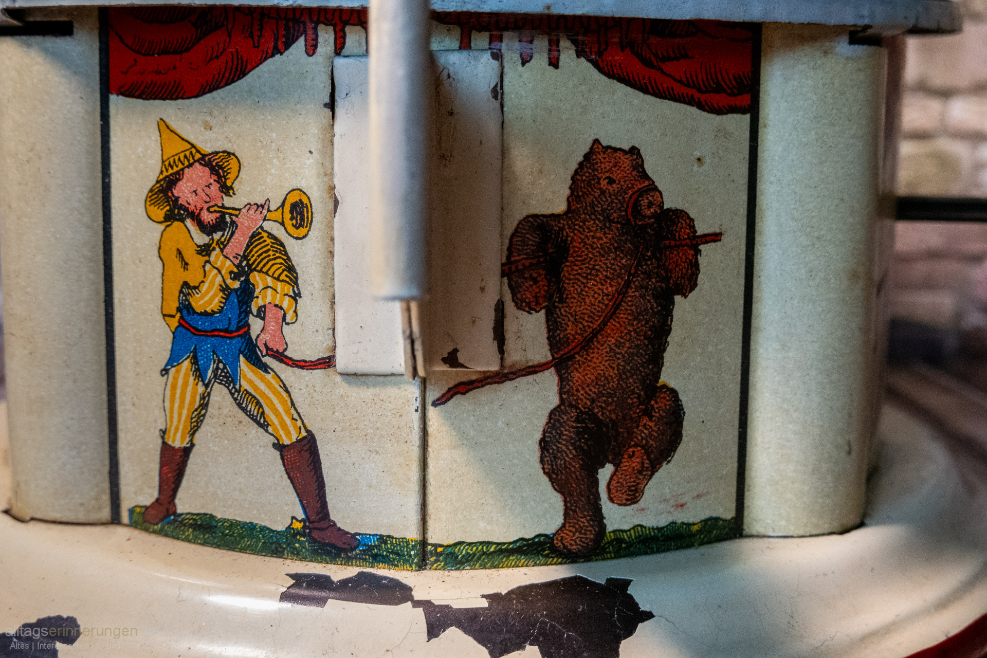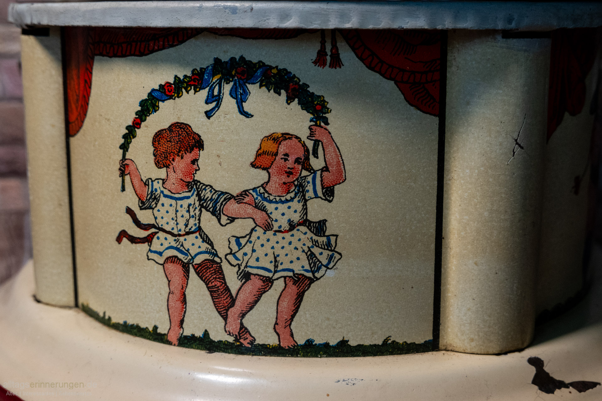 Es ist aus Blech gefertigt, das Gehäuse zeigt ein stilisiertes Theater mit Vorhand und als Motive dienen tanzende Kinder oder auch Bären.