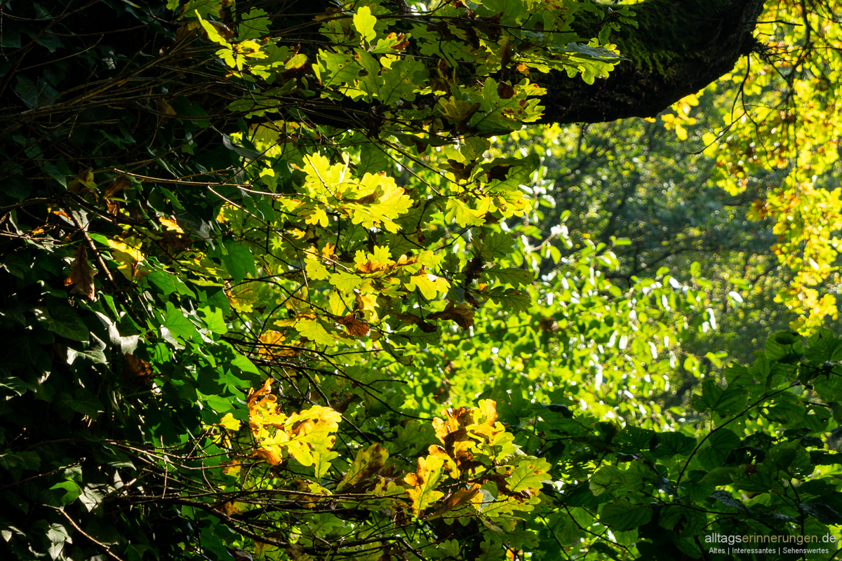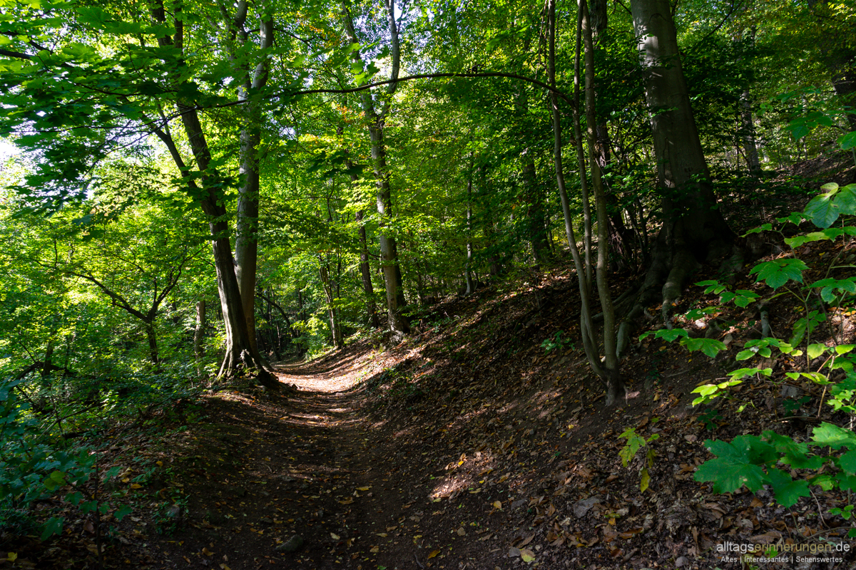 Die rötlichen Steine der steilen Abbruchkanten kann ich immer wieder durch die Bäume sehen.