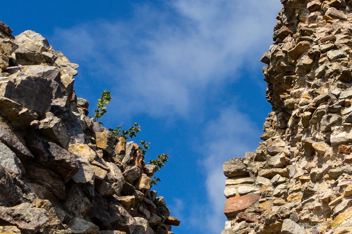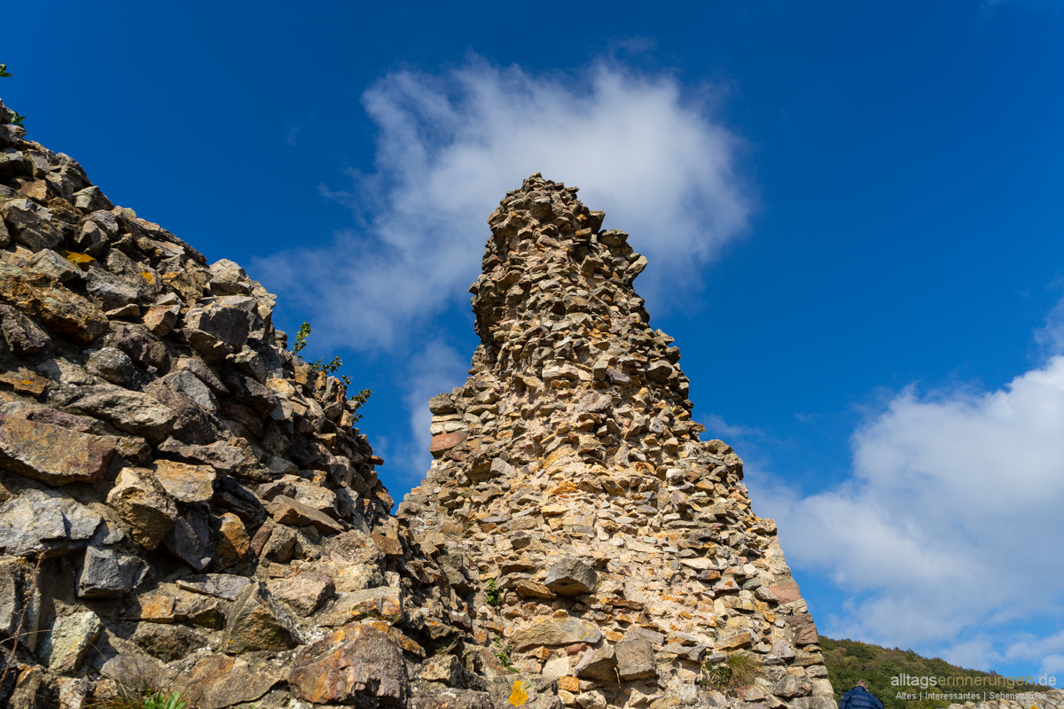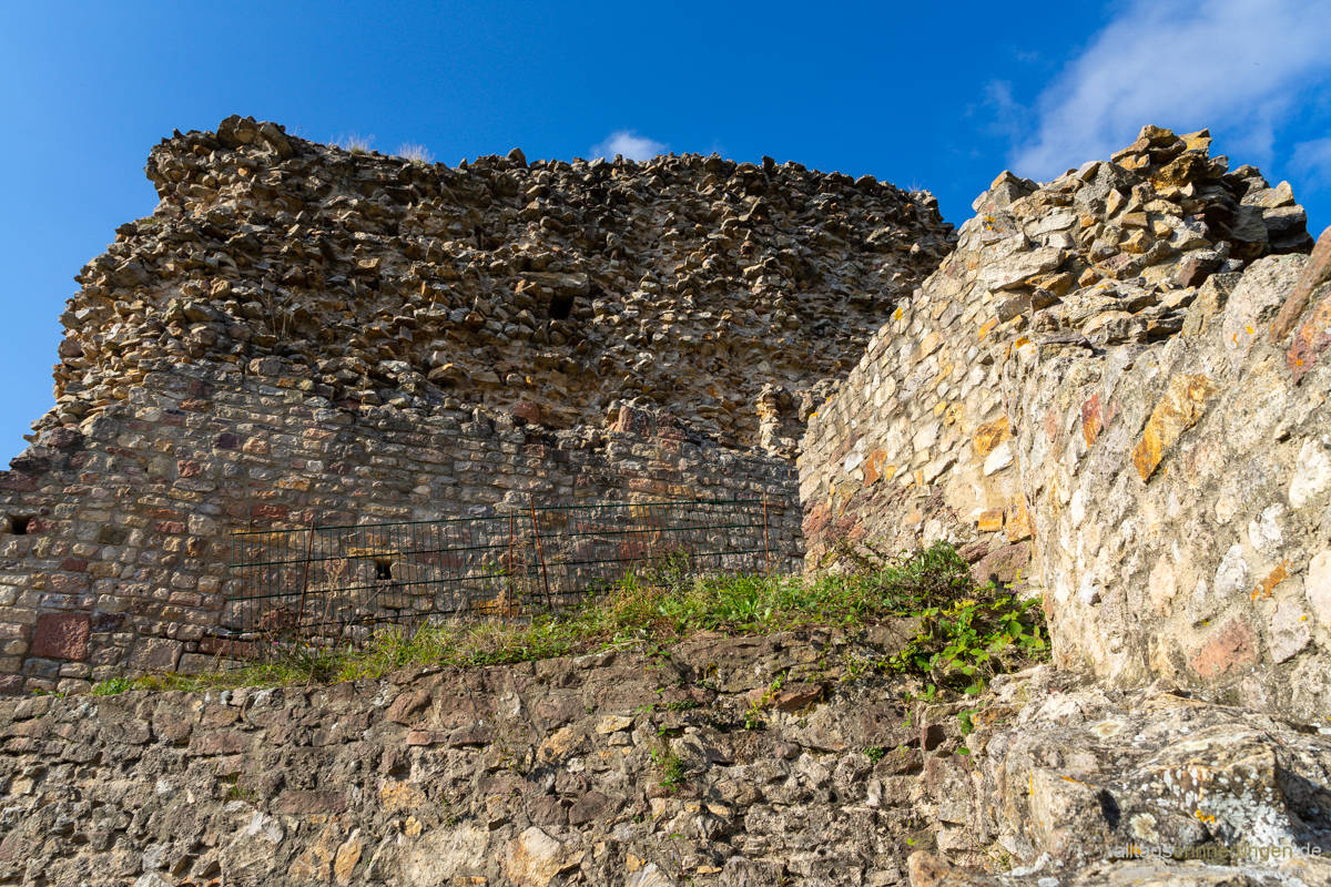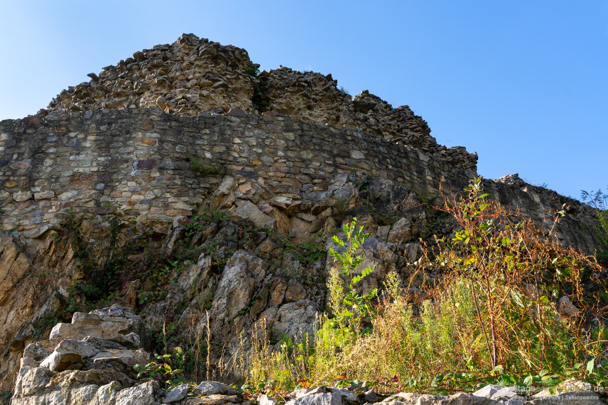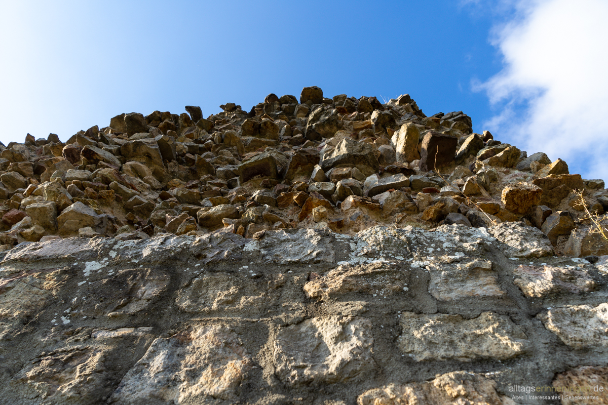 Einige Mauerreste sind noch vorhanden. Schätze diese erreichten einmal eine Dicke von über 3 Metern. Wird sich um eine Schildmauer handeln. Früher freilich weit höher als heute.