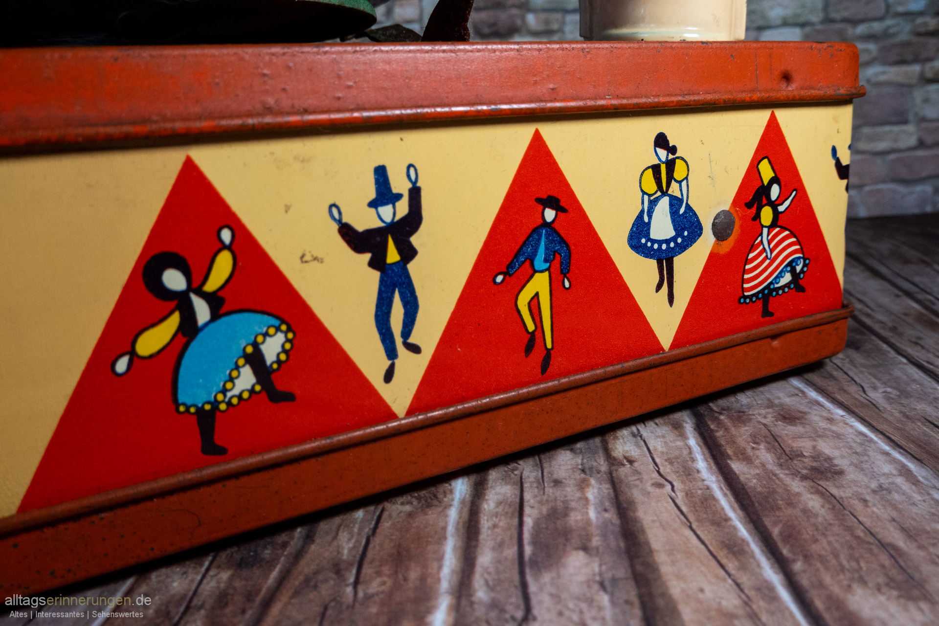 Rechteckige Form, rundherum tanzende Figuren und aus Blech.