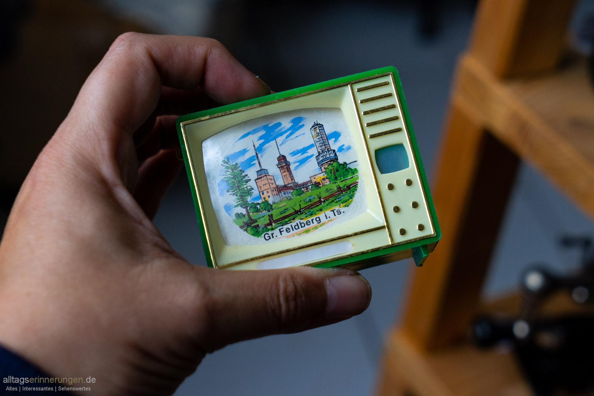 Im Inneren dreht sich eine kleine Scheibe mit den Negativen und diese werden durch das einfallende Licht beleuchtet. Schaust Du durch das kleine “Guggloch” wird das Bild schön sichtbar. Auf der Scheibe des “Fernsehers” war meist, aber nicht immer, eine Abbildung der Sehenswürdigkeit aufgebracht.