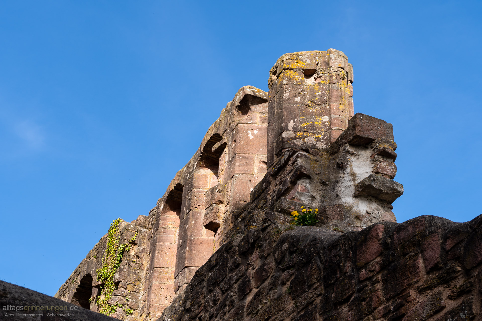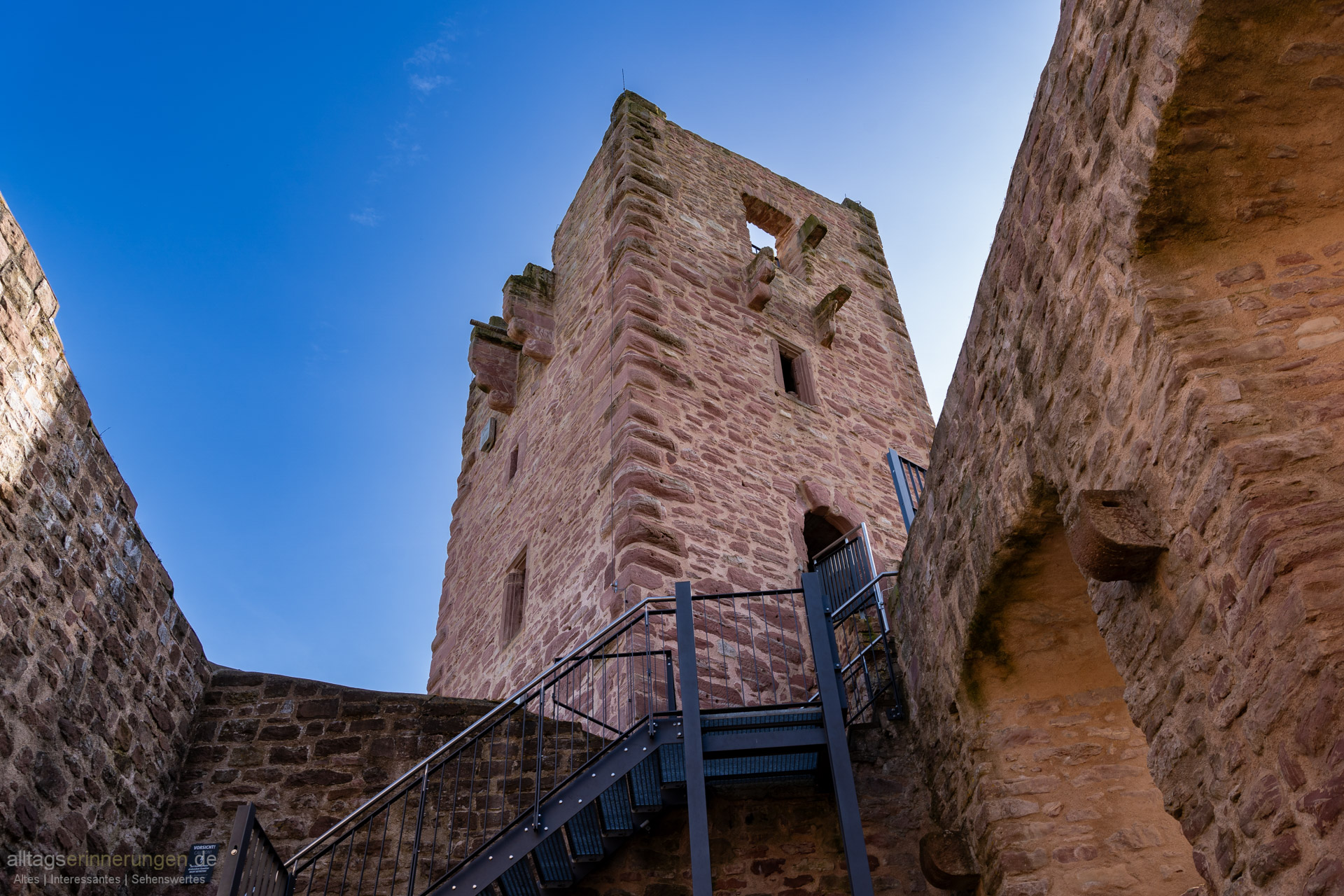 Zwischen dem westlichen und östlichen Palas (oder was davon erhalten ist) erheben sich zwei mächtige Bergfriede in die sonnigen Höhen.