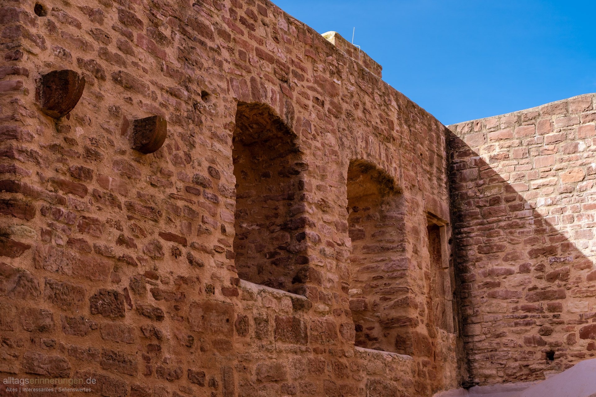 Ich bin an meinem Ziel angelangt und hoch recken sich die Mauern und Türme der Anlage über mir in den blauen Himmel.