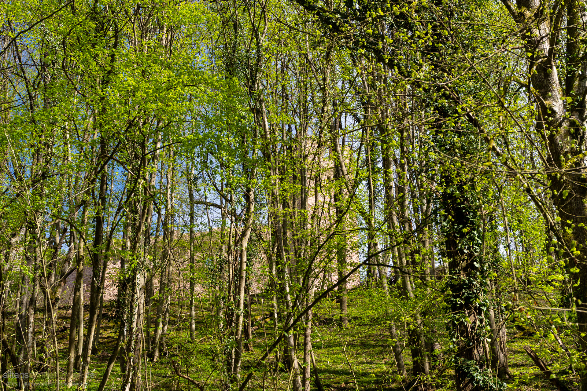 Und nach einem kurzen, aber steilen, Anstieg sehe ich die Mauern durch die noch spärlich begrünten Bäume.