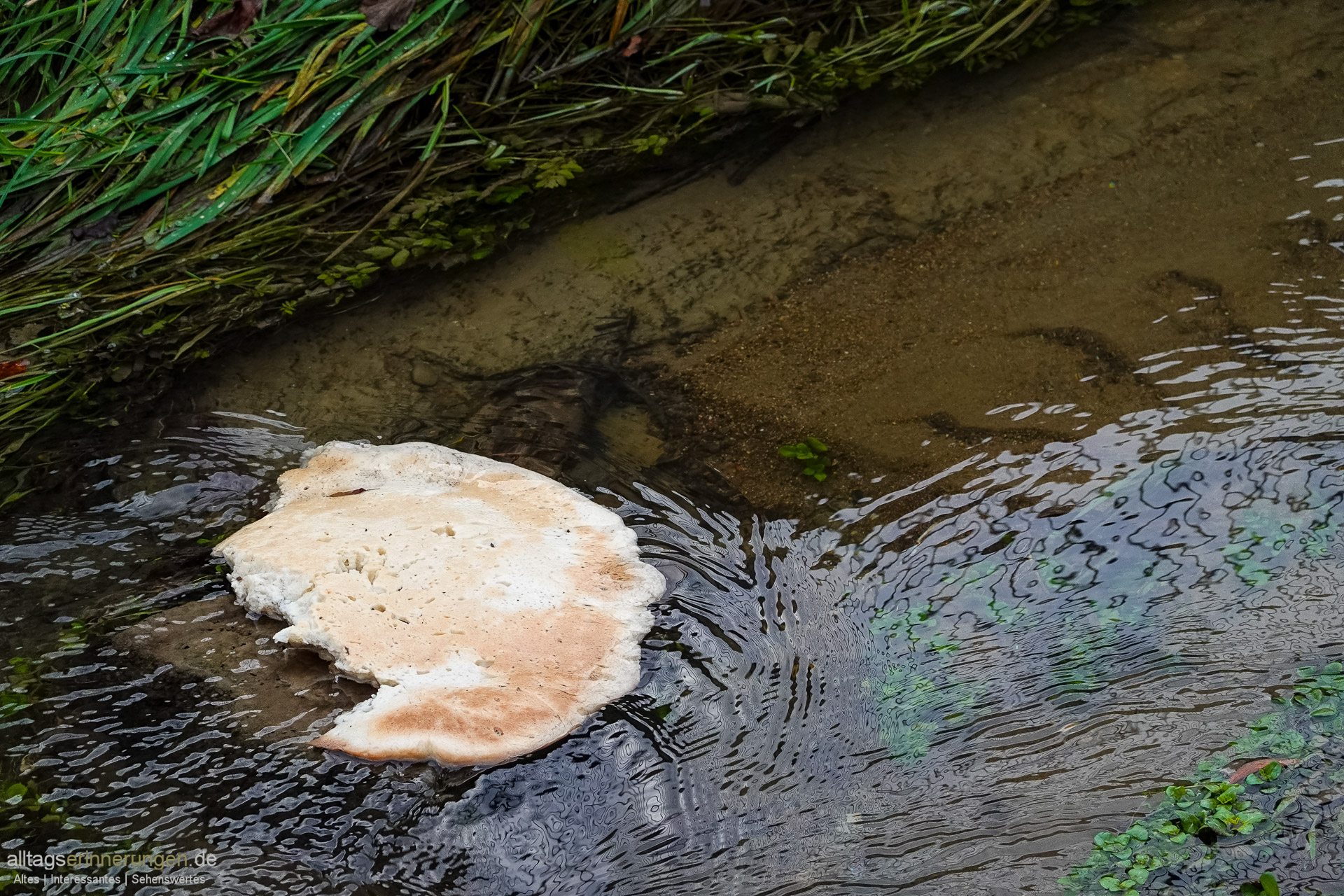 Die Bach im Bild ist der Wembach (oder die?). Ob es sich bei dem schwimmenden Objekt um ein Stück Pizza oder einen Pilz handelt kann ich nicht sagen. Mein Tipp geht auf ein Stück Nahrung. Auch hier bin ich mir nicht sicher.