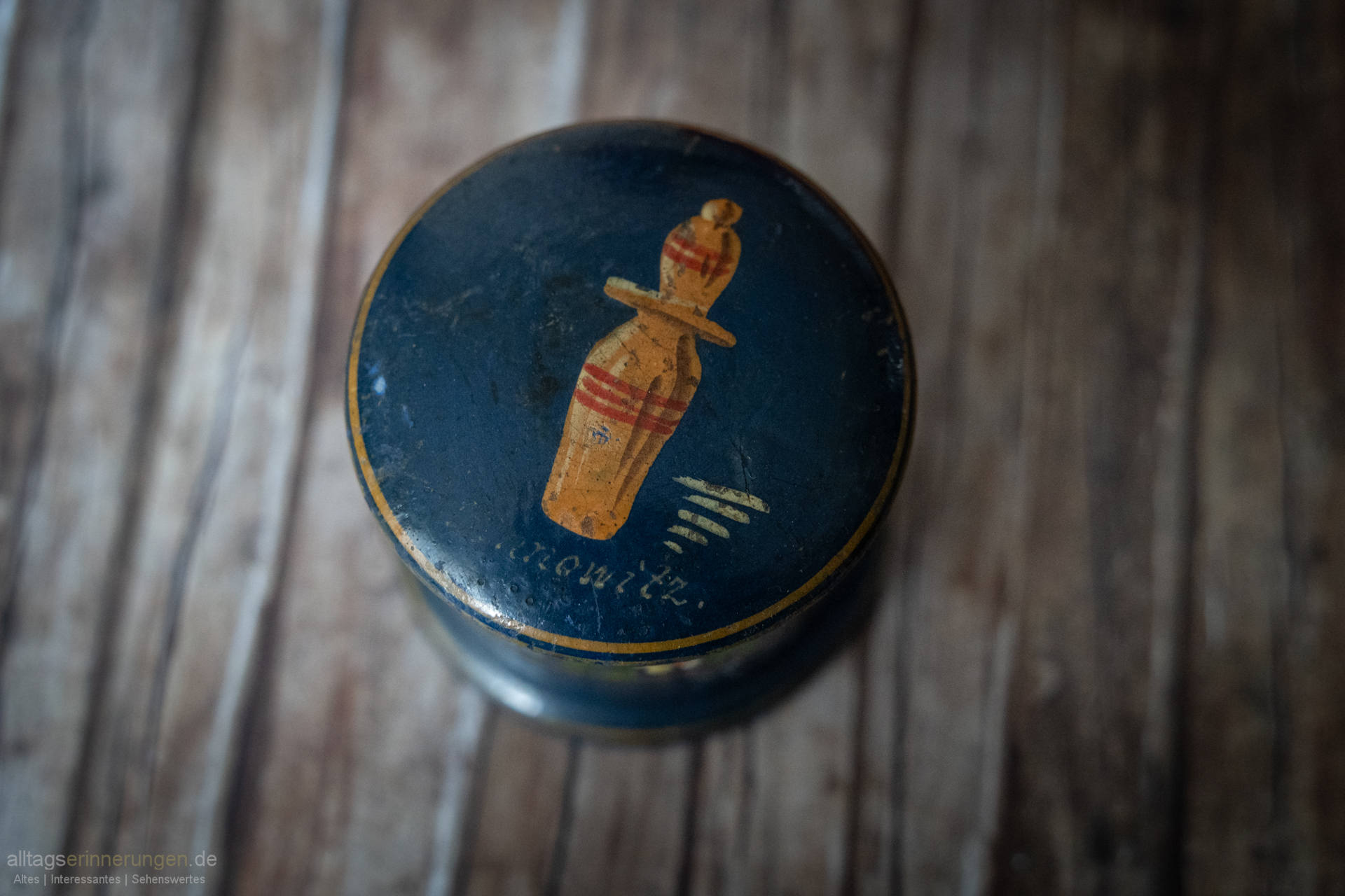 Auf der bemalten Dose ist ein Schriftzug in Ansätzen zu erkennen. Leider kann ich ihn nicht vollständig lesen.