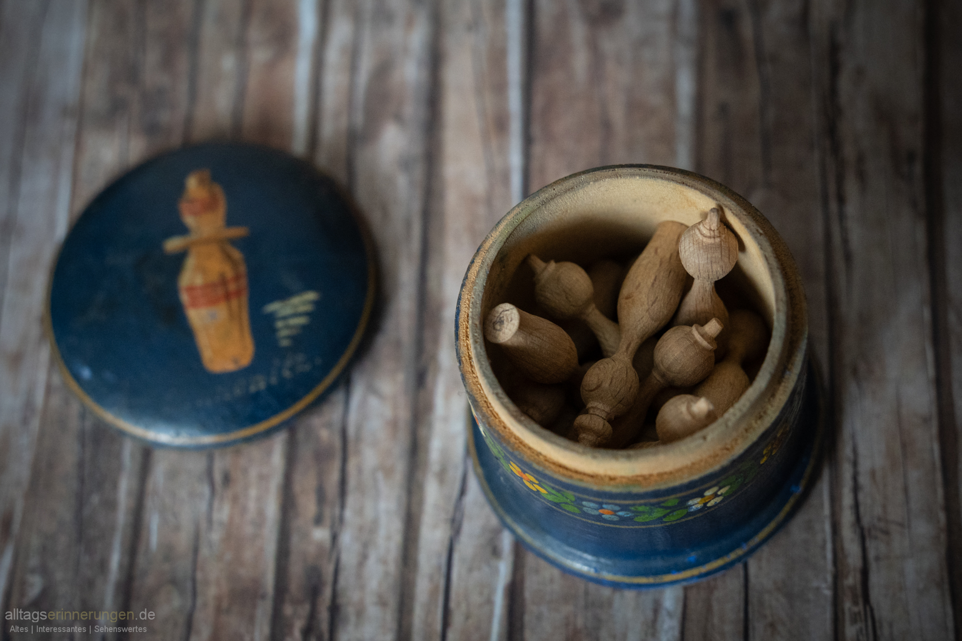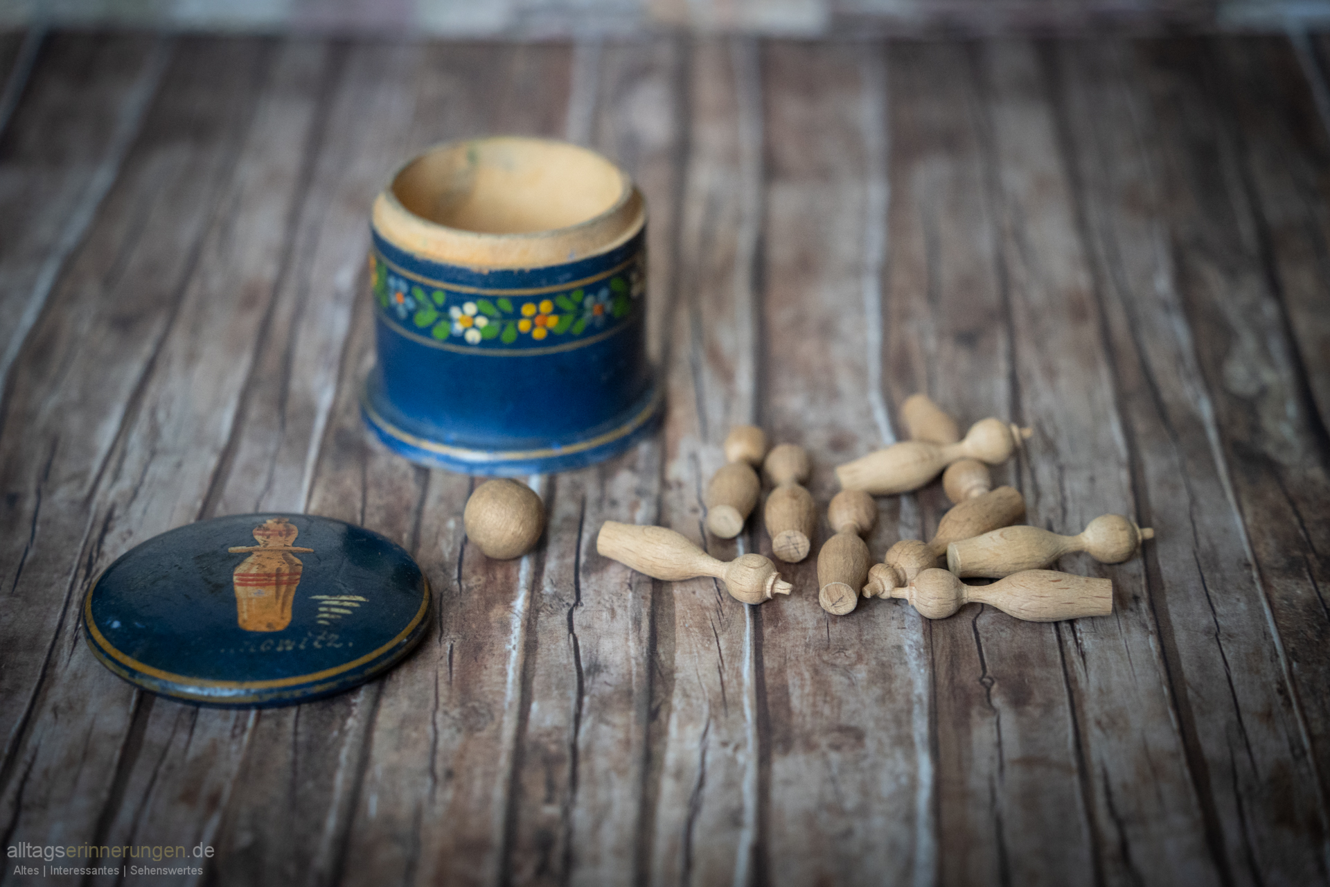 Die „Dose“ ist aus Holz und die Kegel samt Kugel ebenfalls.