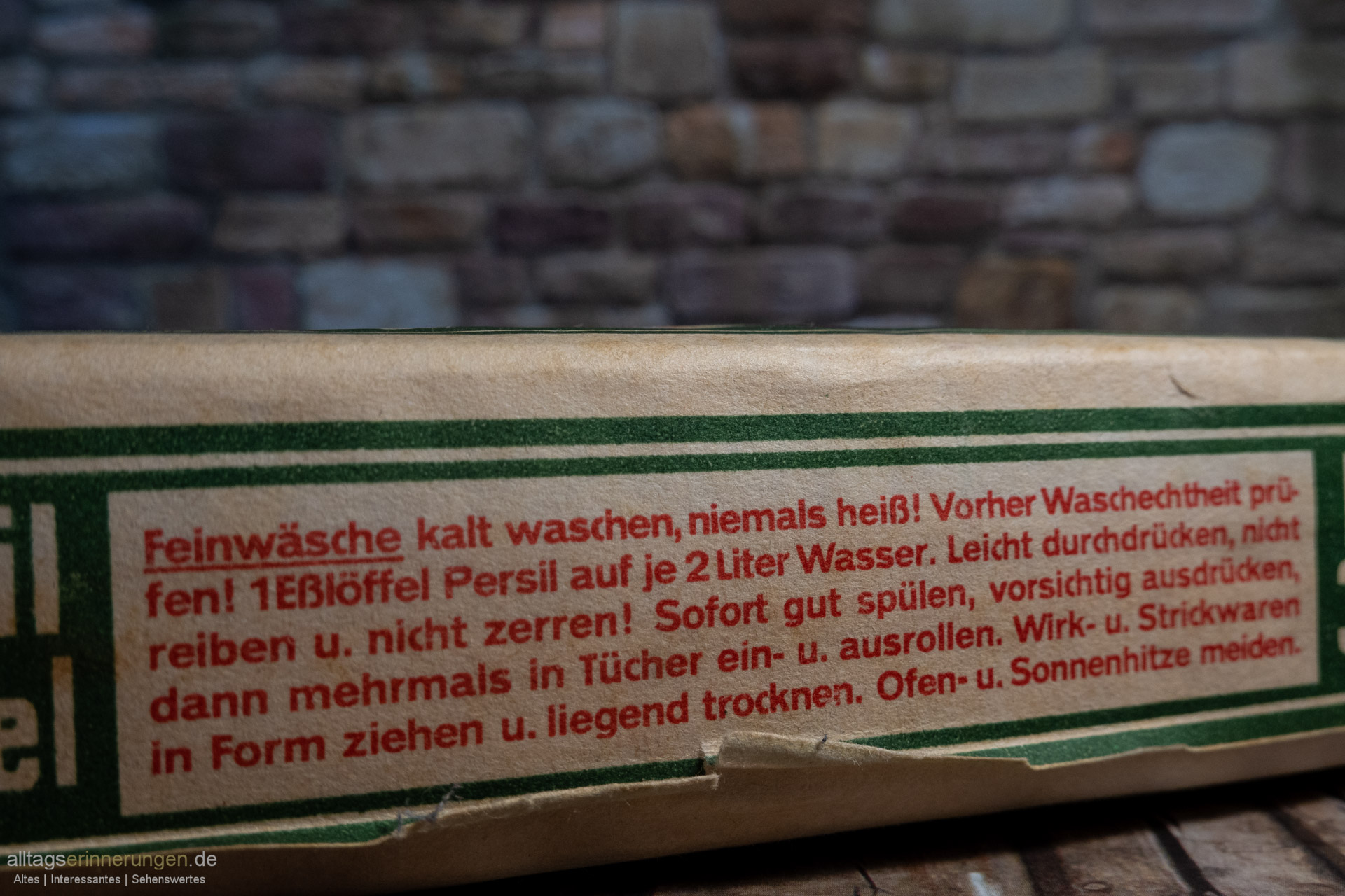 Mehr Informationen befinden sich auf den schmalen Längsseiten. Einmal Hinweise für die Feinwäsche und gegenüberliegend die Hinweise für die Buntwäsche. Dazu der Preis der Packung von 30 Pfennige.