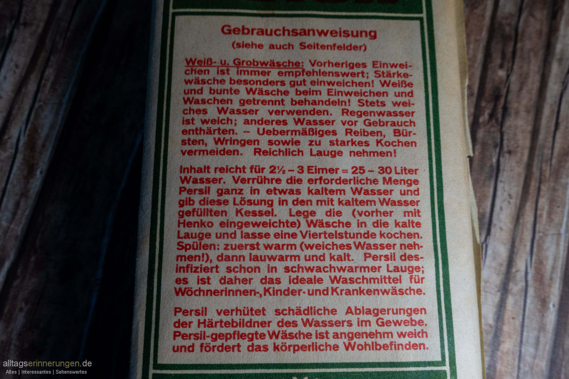 Inhalt reicht für 2 ½ bis 3 Eimer = 25 bis 30 Liter Wasser. Verrühre die erforderliche Menge Persil ganz in etwas kaltem Wasser und gib diese Lösung in den mit kaltem Wasser gefüllten Kessel. Lege die (vorher mit Henke eingeweichte) Wäsche in die kalte Lauge und lasse eine Viertelstunde kochen. Spülen: zuerst warm (weiches Wasser nehmen), dann lauwarm und kalt. Persil desinfiziert schon in schwachwarmer Lauge; es ist daher das ideale Waschmittel für Wöchnerinnen-, Kinder- und Krankenwäsche.