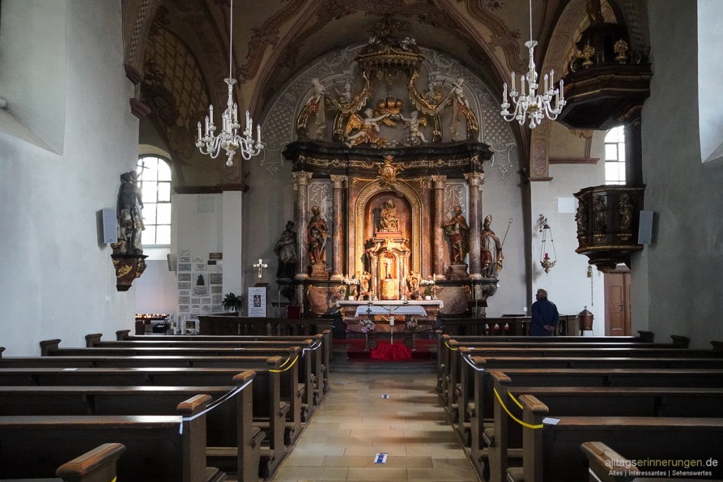 Ein einschiffiges Langhaus wird ergänzt durch zwei Joche, sowie ein ehemaliger gotischer Chor mit weiteren drei Jochen. Die Decke findest Du gewölbt vor, was den sakralen Eindruck noch verstärkt.